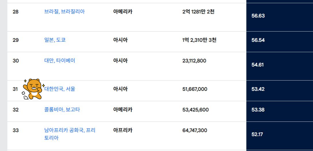 - 한국은 31위로 일본(29위), 대만(30위)보다 뒤쳐져