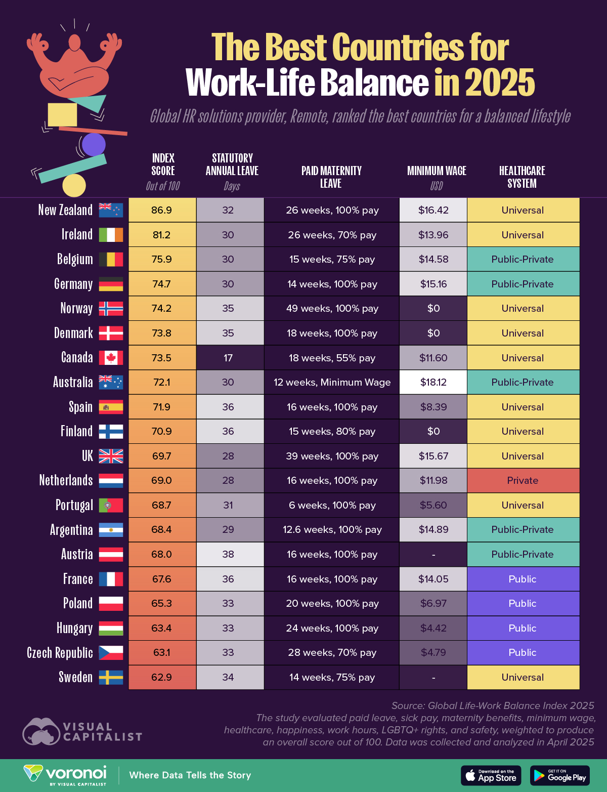 Global Life-Work Balance Index 2025 | Best Life-Work Balance Countries | Remote