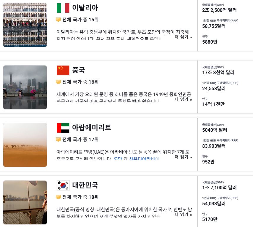 우리나라의 순위가 더 높을 줄 알았는데, 국내 총생산, GDP 등 절대적인 수치가 낮은 것은 순위에 큰 영향을 미쳤을 것 같다.