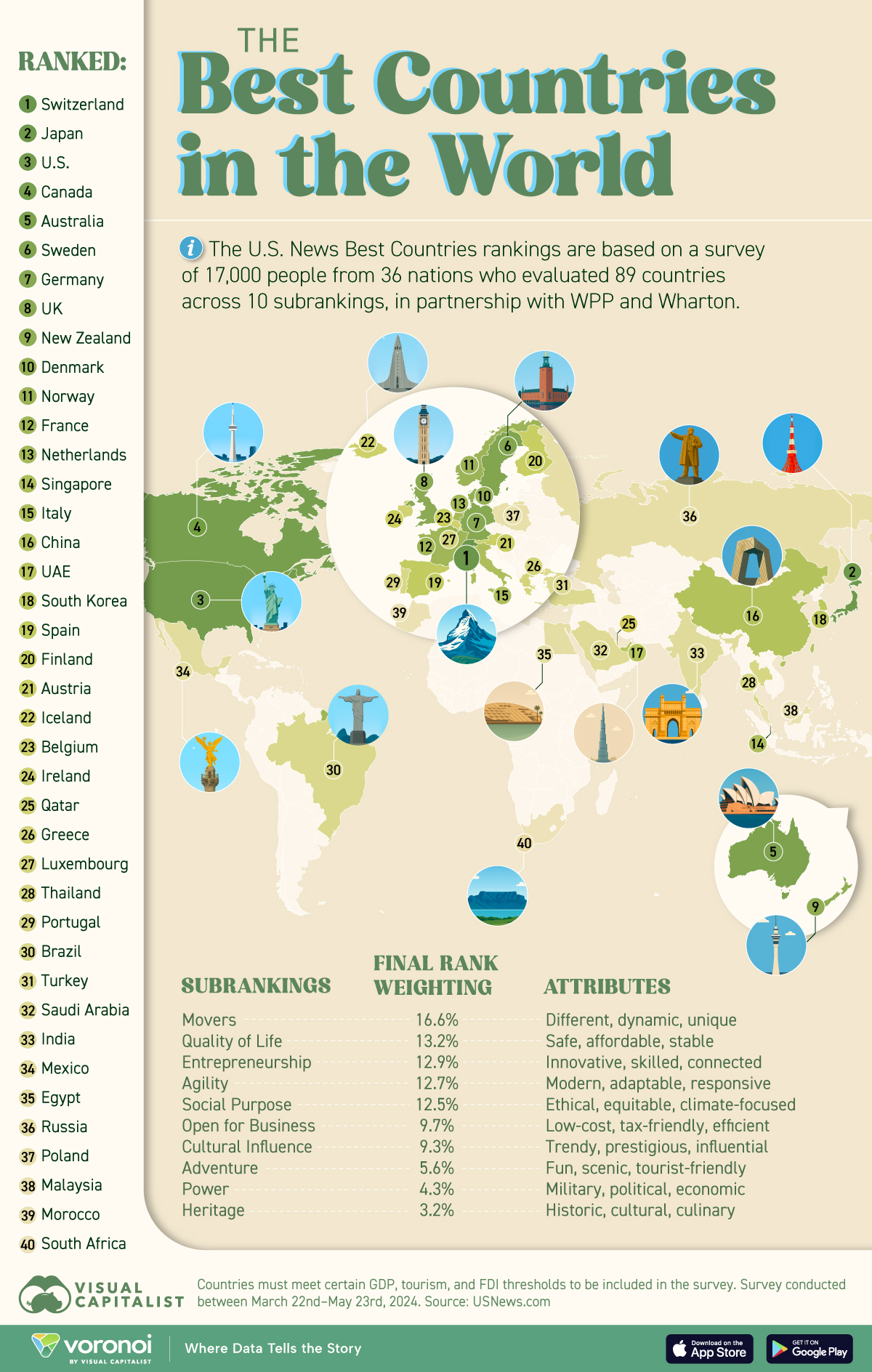 - US News & World Report가 선정한 2024년 "최고의 국가" 순위에서 스위스가 1위를 차지.