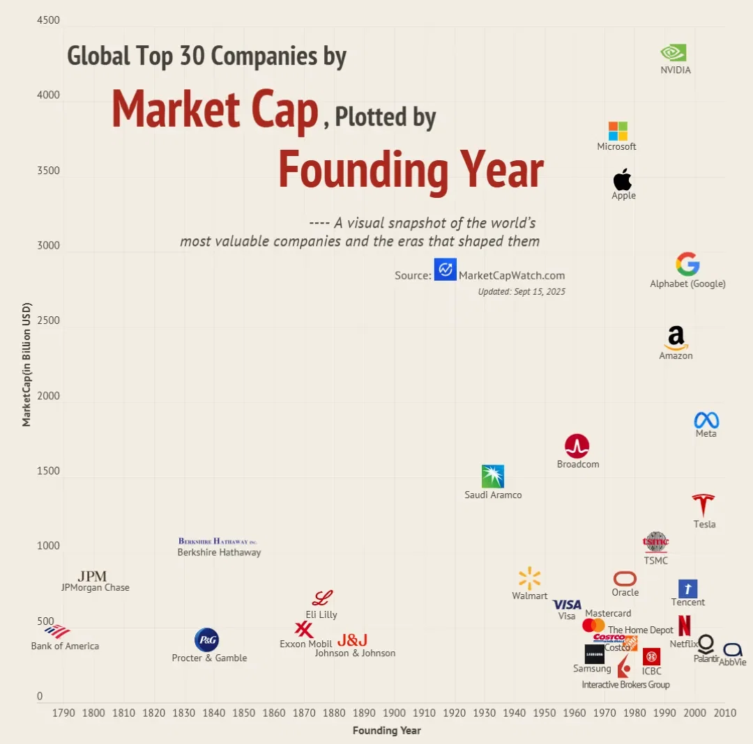This chart maps the world’s 30 most valuable companies — from Bank of America (founded 1784, Bank of America market cap is $375B) to NVIDIA (founded 199…