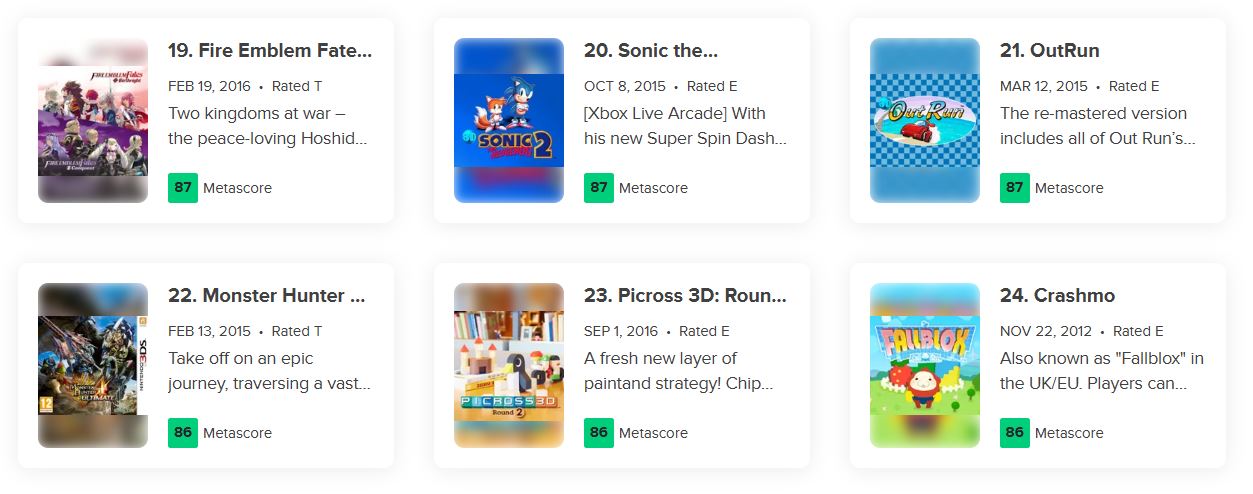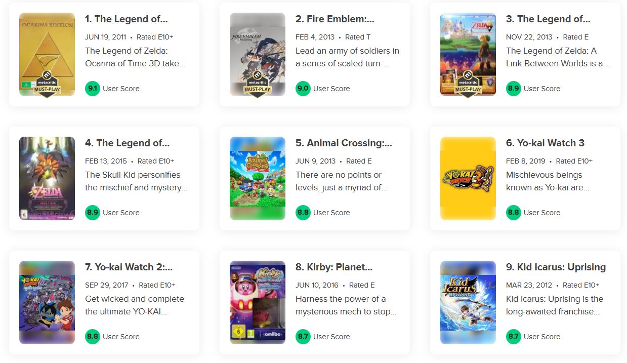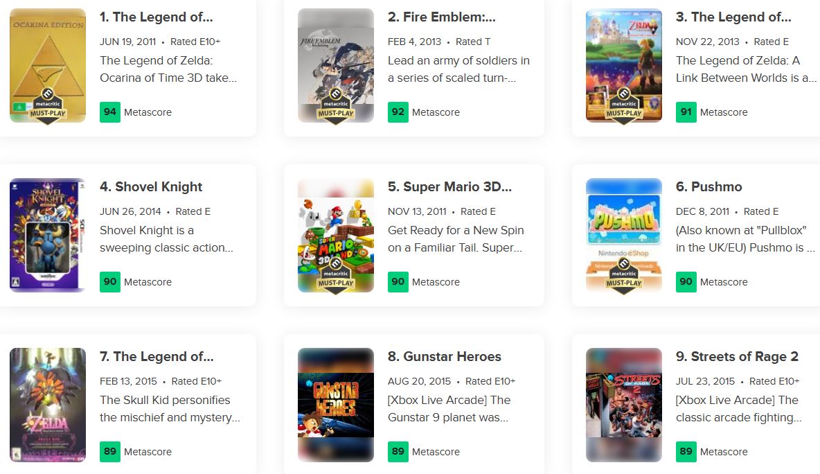 메타크리틱에서 선정한 역대 3DS 게임 평점을 보면