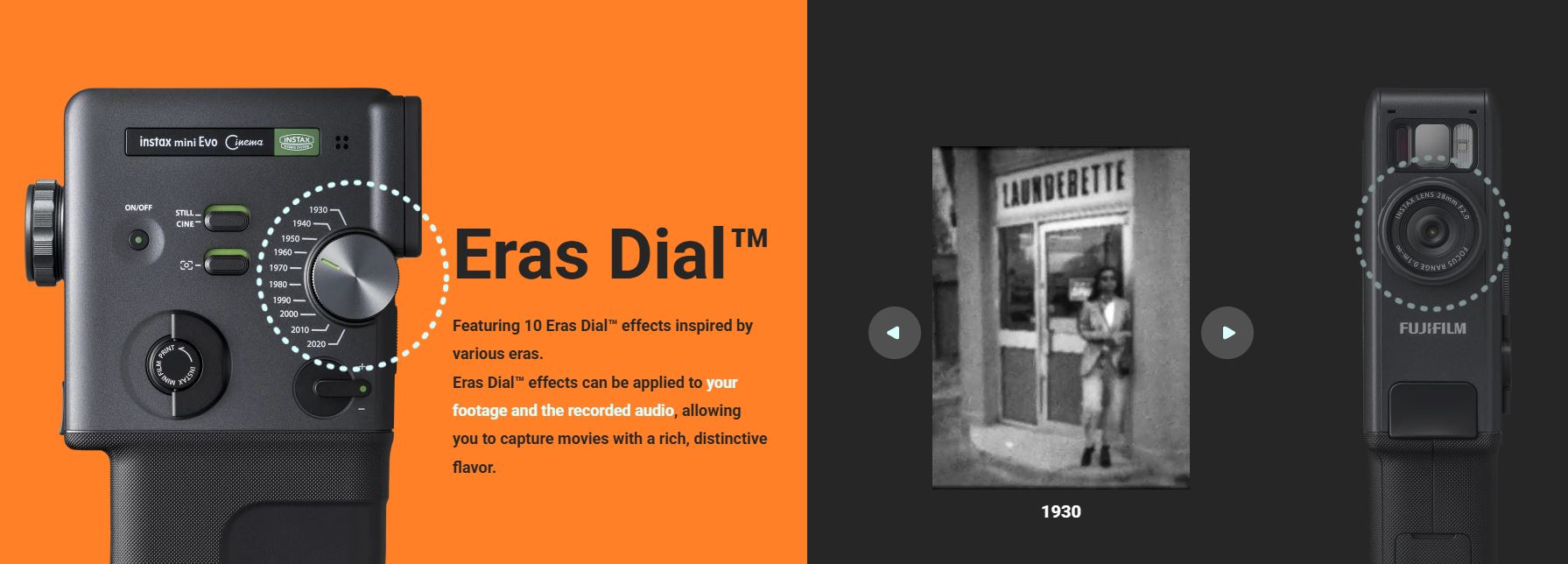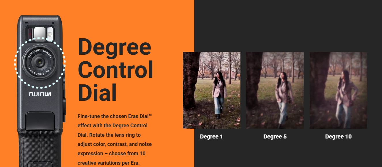 The instax mini Evo Cinema™ is a unique 3 in 1 hybrid camera. You can create 15 second vidoes and print images from your smartphone.The Eras Dial allows you to apply 10 levels of Eras creating an immersive experience allowing you to apply effects represe