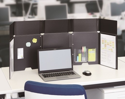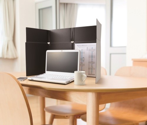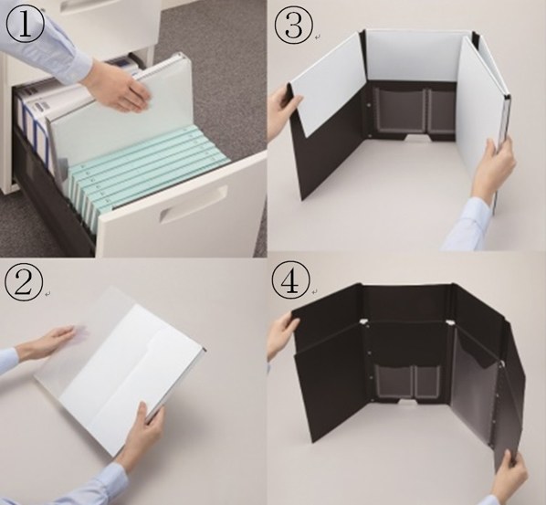 이 제품은 접어서 보관하다가 주위의 시선을 막고 싶을 때, 책상 위에 펼쳐서 외부와 독립된 업무 공간을 확보하는 제품.