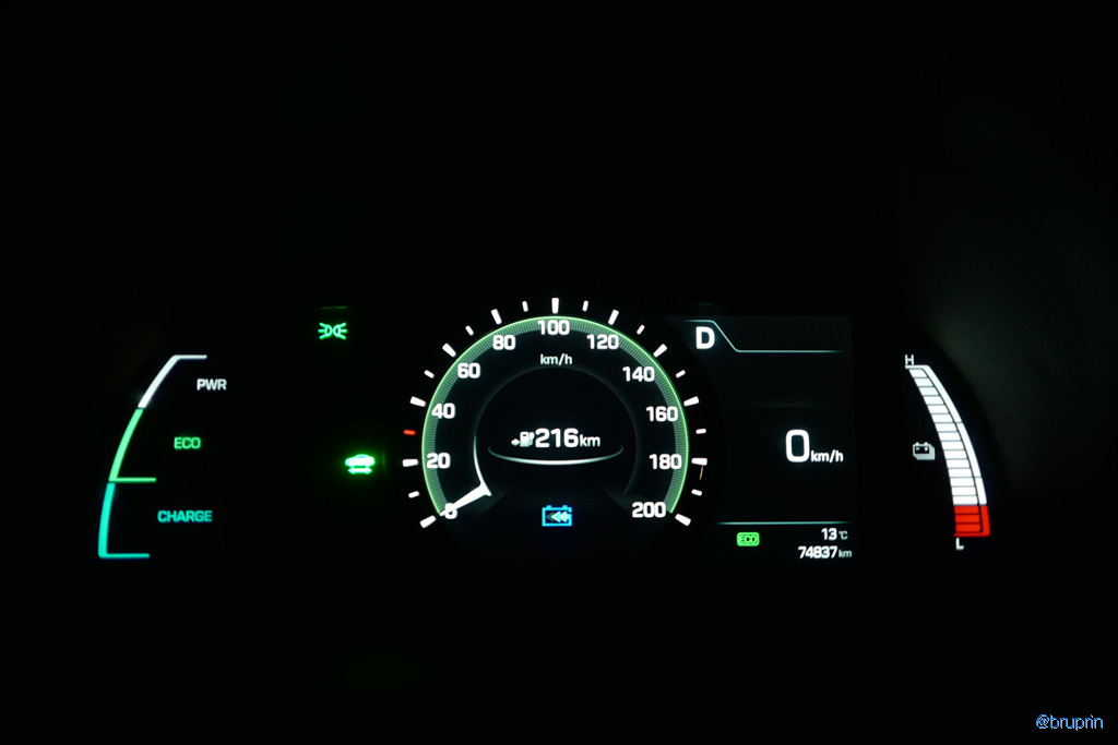 왼쪽은 배터리 상태, 중앙은 속도, 오른쪽은 주행모드와 차량 정보, 그리고 배터리 수준