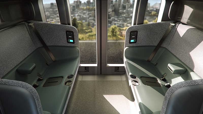 자율 주행 차량이기 떄문에 운전대 없이 2명이 서로 마주 앉는 형태로 내부가 구성돼 있다.