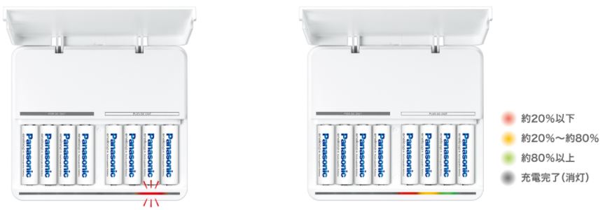 센서가 탑재되어 있어 충전지의 충전 상황을 LED로 확인할 수 있으며 2.5시간 급속 충전이 가능.
