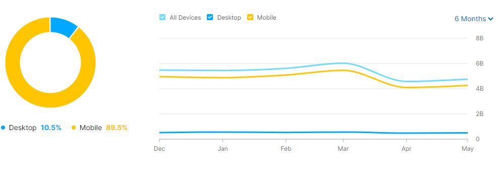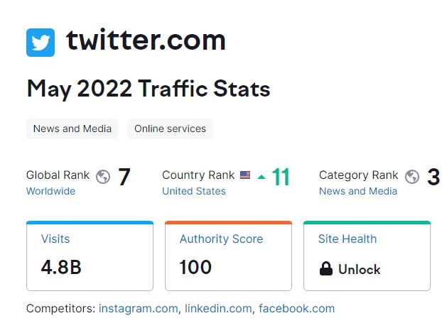 참고로 2022년 5월 기준으로 트위터의 인터넷 서비스 순위는 7위, 48억 명이 방문했으며, 뉴스&미디어 부문의 3위를 차지하고 있다.