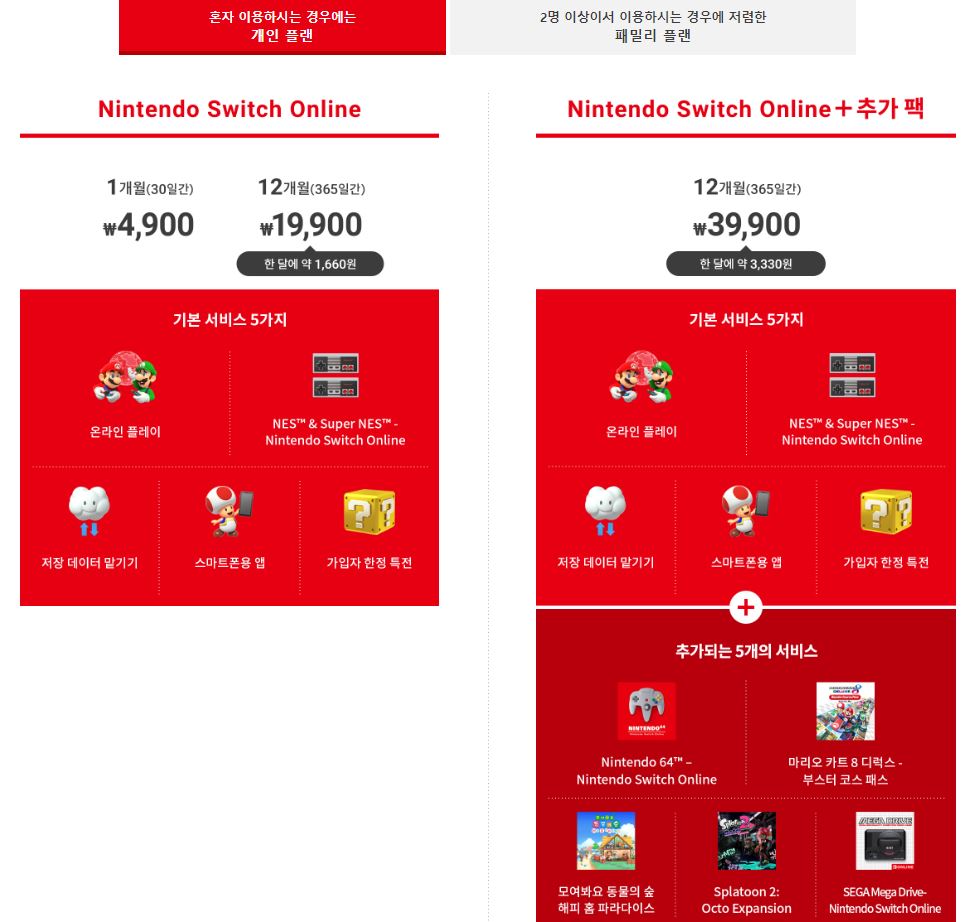 참고로 닌텐도 스위치 온라인 구독 서비스는 다음과 같다.