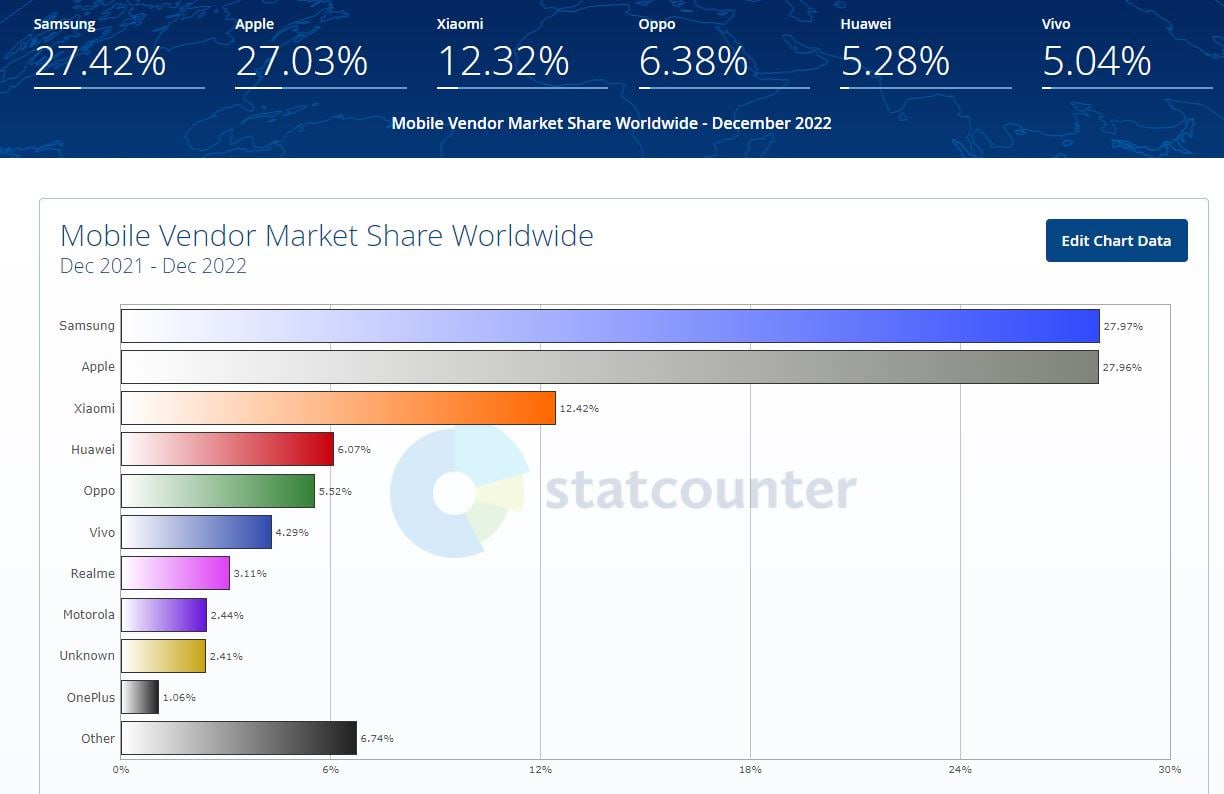 Mobile Vendor Market Share Worldwide | Statcounter Global Stats