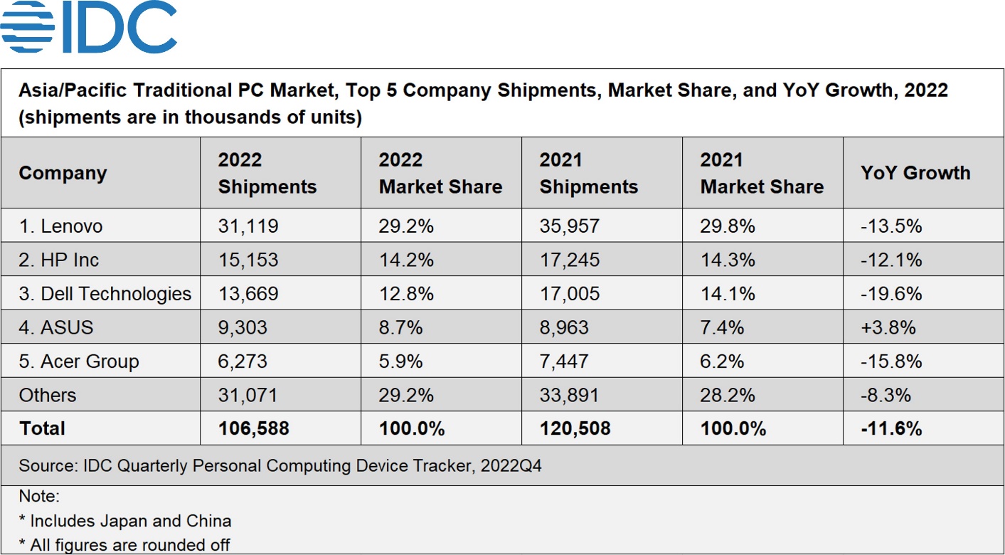 Asia/Pacific PC Market Down by 11.6% in 2022, Slow Demand and Macroeconomic Conditions to Blame