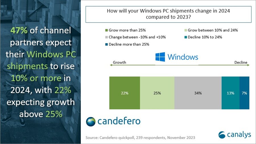 Canalys 수석 분석가 Ishan Dutt는 "장기간 구매 지연으로 인해 상업 부문은 2024년에 수요가 급증할 준비가 되어 있다"라고 말했다. “내년 PC 비즈니스 성과에 대한 채널 감정은 긍정적. 11월 설문조사에 참여한 파트너 중 47%가 내년에 Windows PC 출하량이 10% 이상 증가할 것으로 예상.