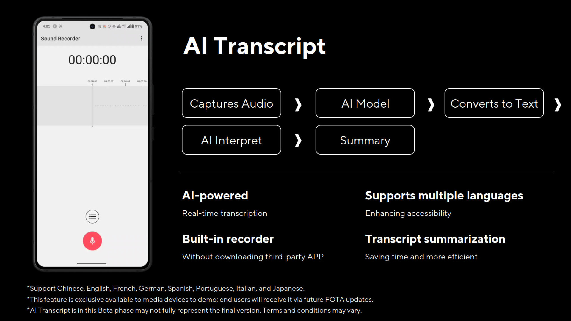 'AI 문자'는 녹음한 음성을 AI 모델로 텍스트화하는 것으로 지원 언어는